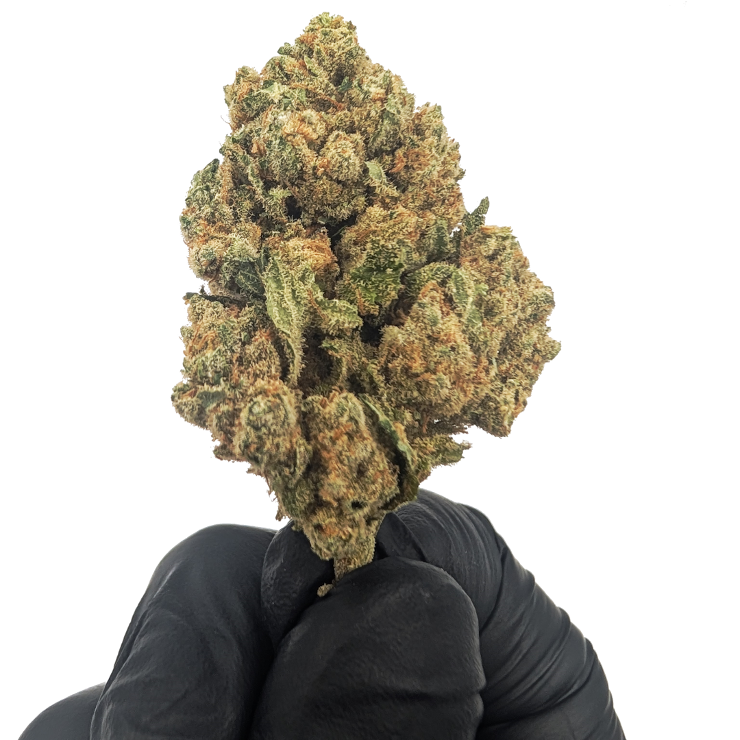 Wir haben uns für die Sorte Orange Sherbet entschieden, um Ihnen große Knospen anbieten zu können. Diese Blume ist eine Kreuzung aus Orange Cream, Purple Urkle und Cherry Pie und entwickelt kompakte Buds mit einer bemerkenswerten Struktur. Die geschwollenen Kelche tragen vibrierende orangefarbene Stempel, die im Kontrast zum tiefen Grün der Knospen stehen.